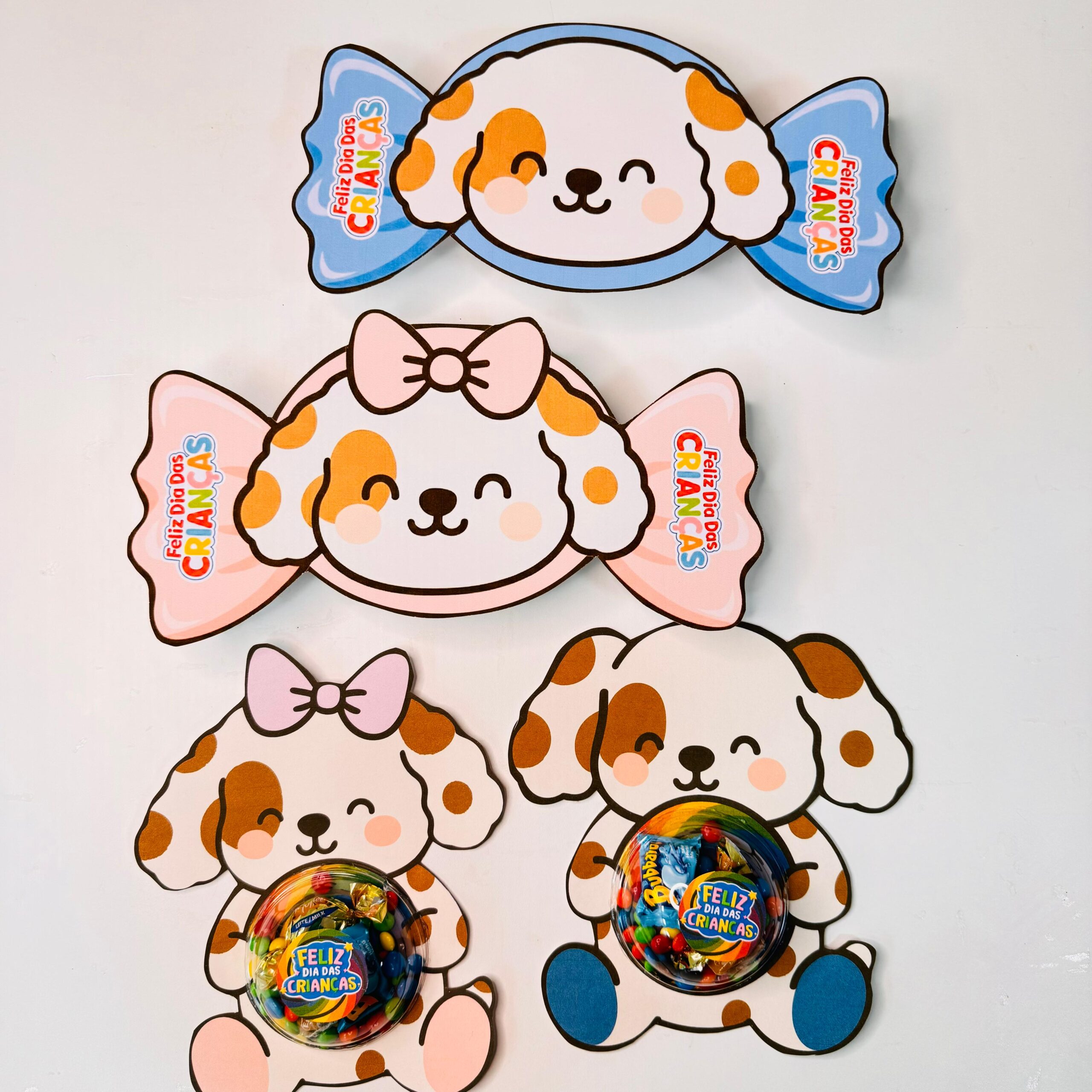 ✅ Modelo sentadinho – o cachorrinho segura um potinho transparente cheio de guloseimas (confetes, balas, chicletes, etc.).