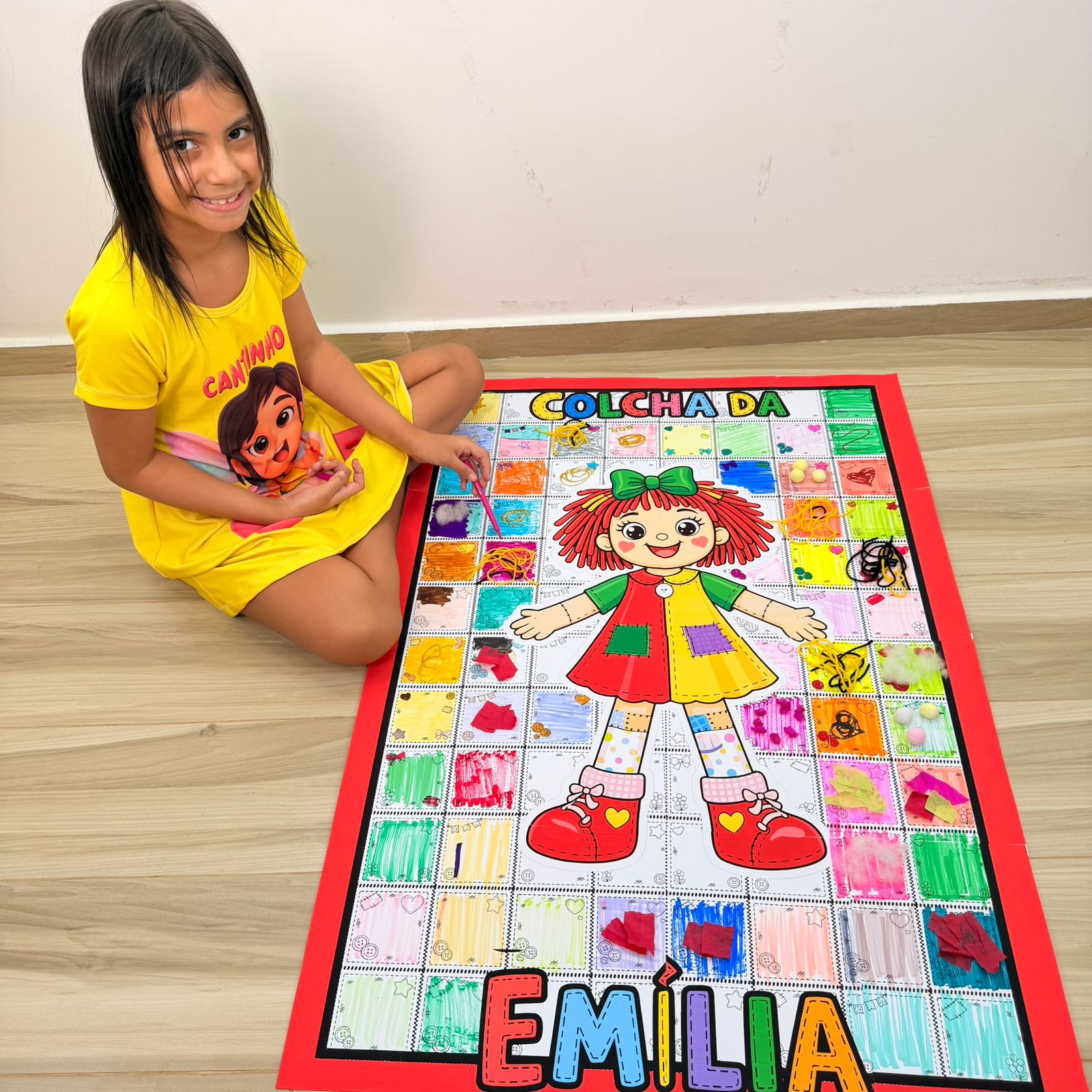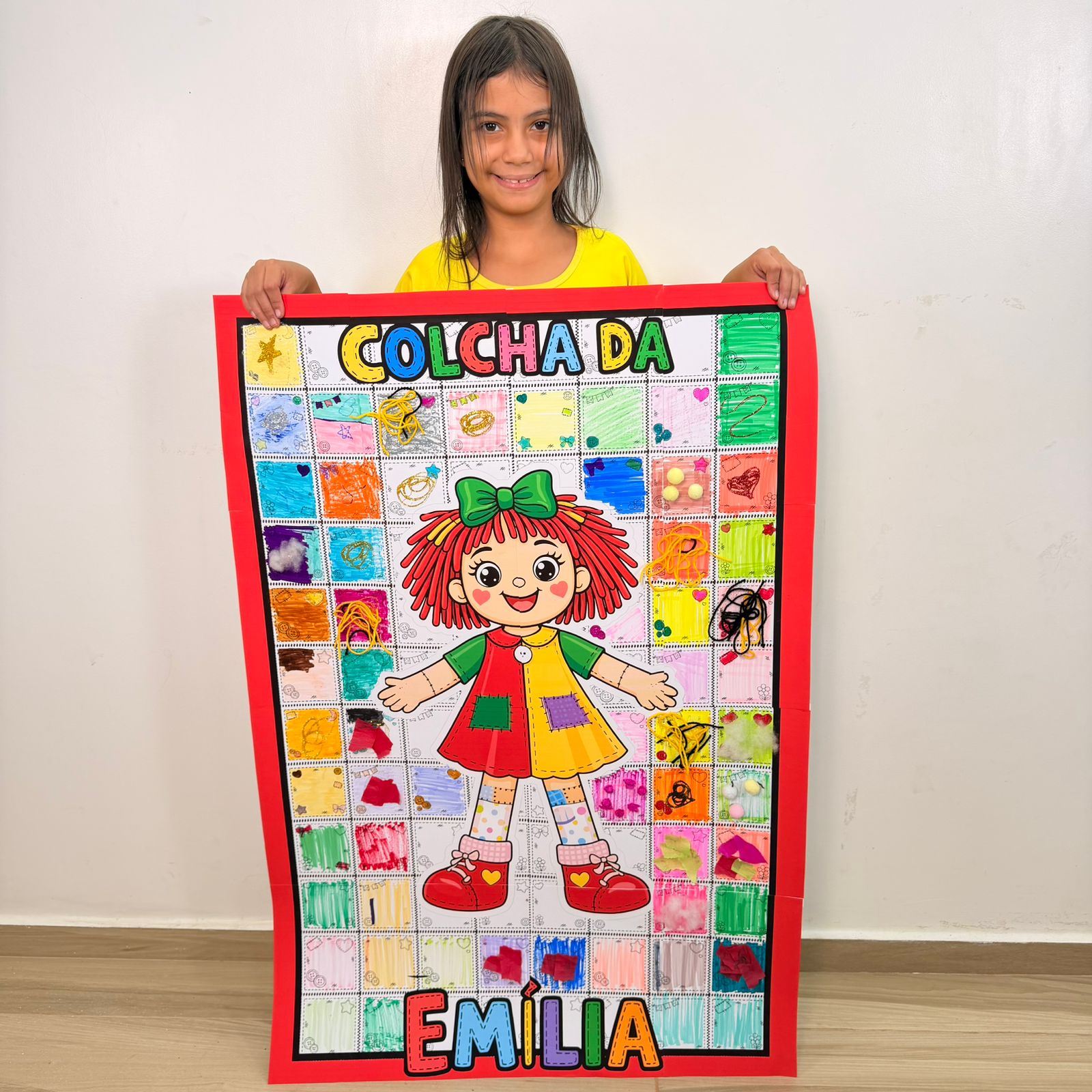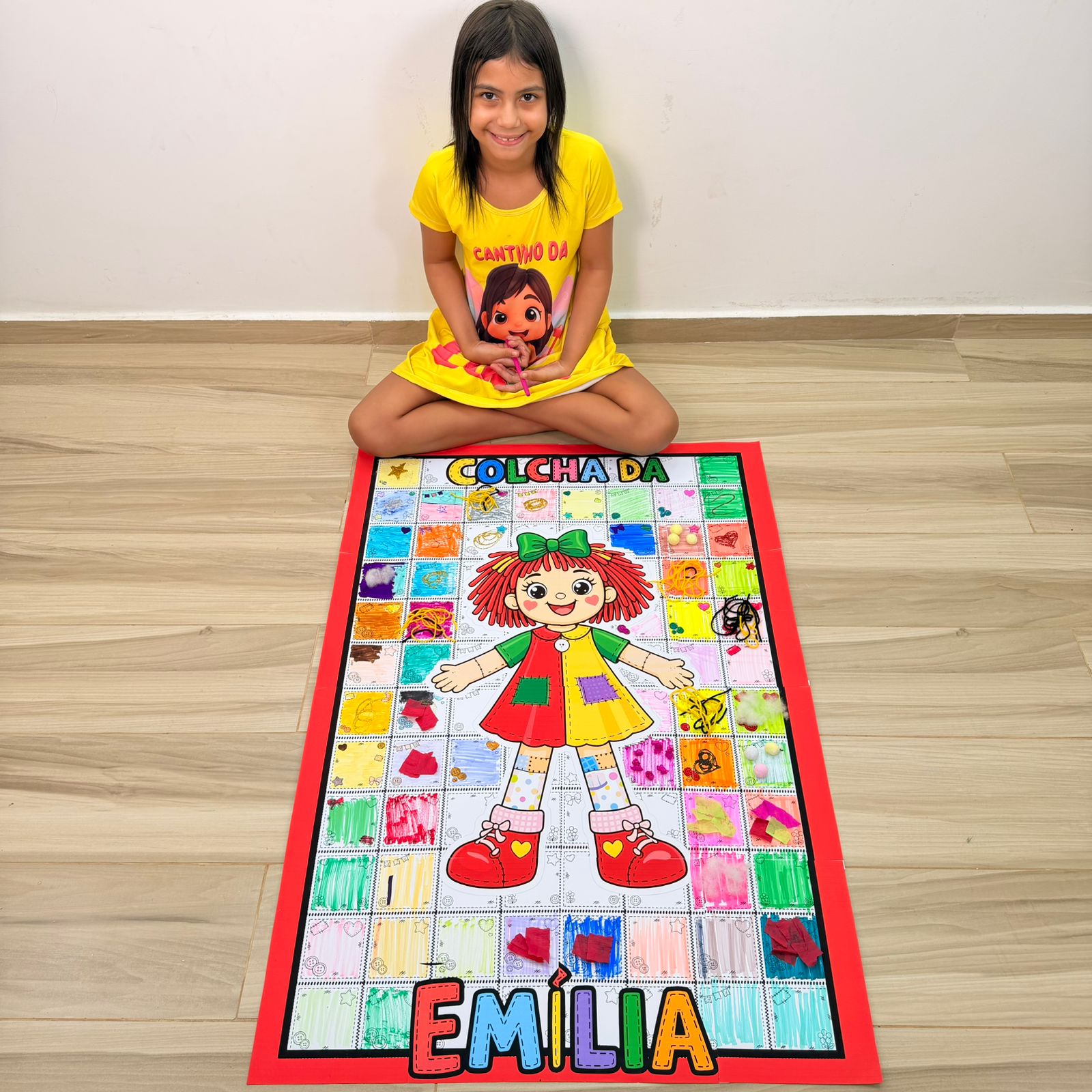 Esse PDF vem com a Colcha da Emília ampliada, perfeita para montar um painel grande e bem chamativo, além de acompanhar o guia da professora com orientações de uso.