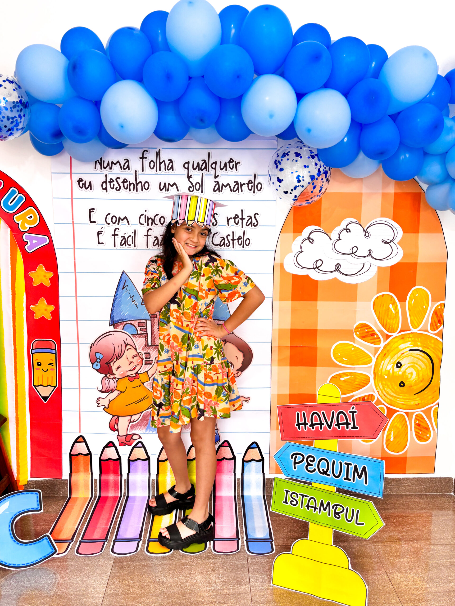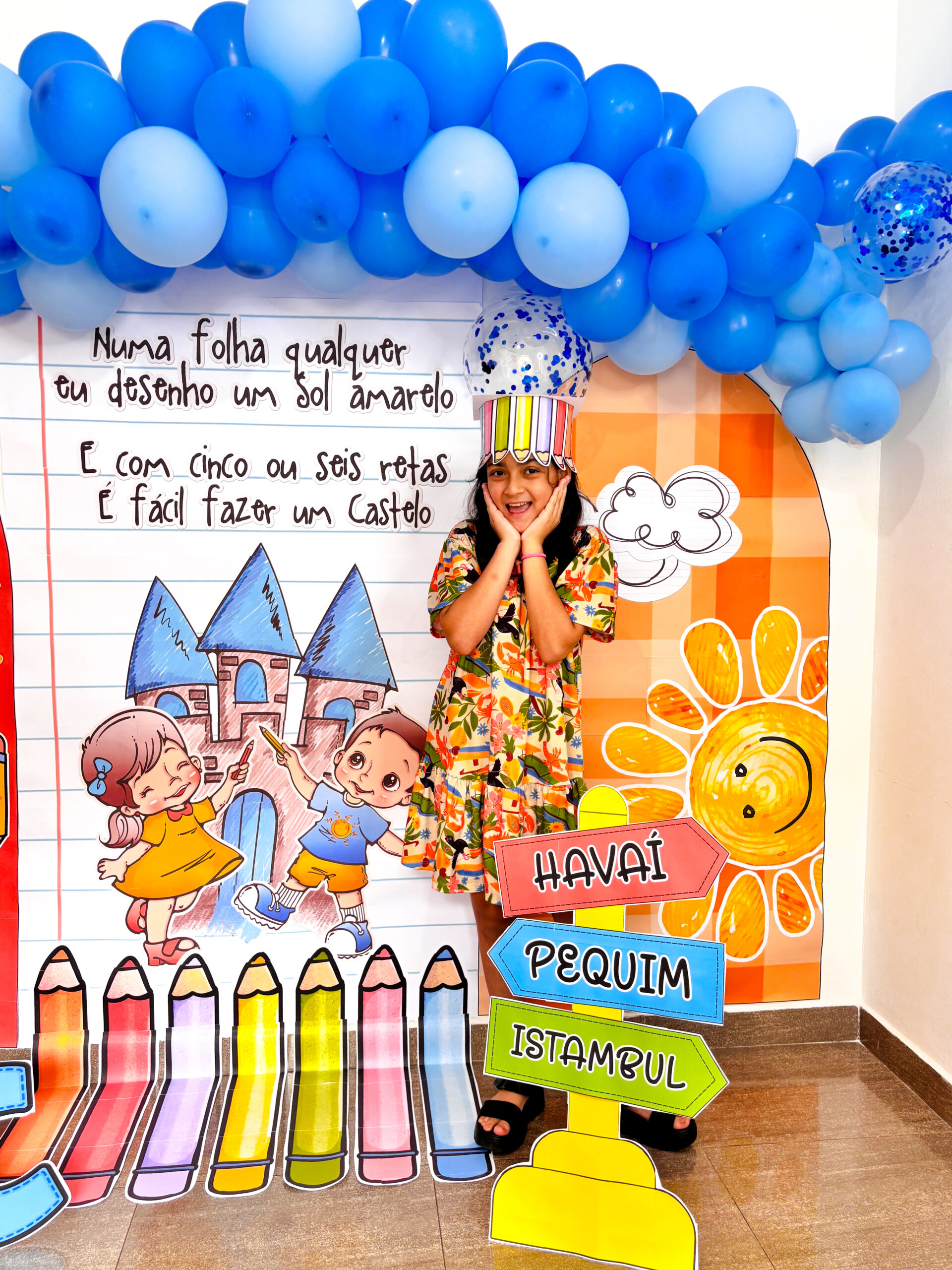 música, enquanto o sol sorridente e o céu azul de balões dão um